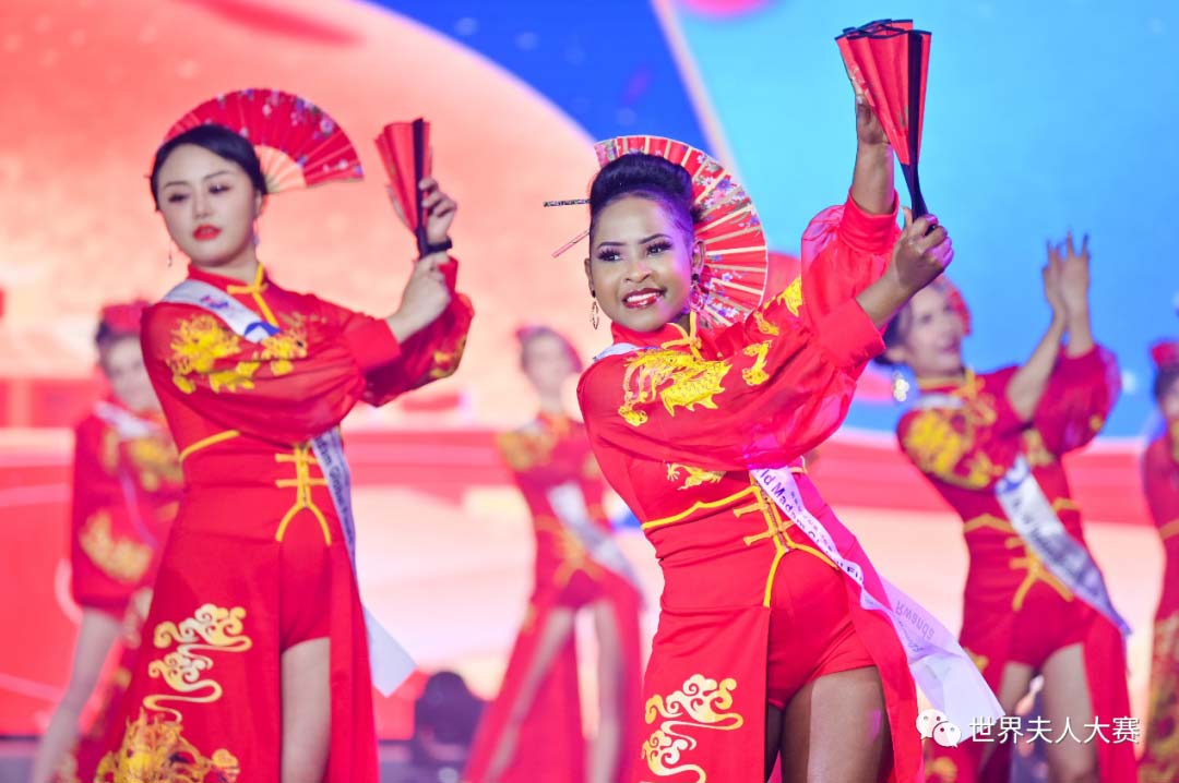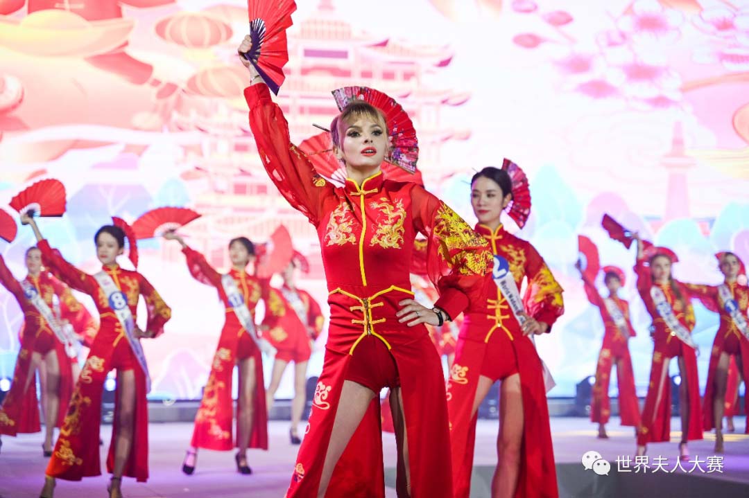 在決賽現場,40位選手身穿具有中國傳統設計風格的服飾手持各國旗幟出場,向世界展示本國文化之美。選手們仿佛成為精靈的化身,搖曳的裙擺,琳瑯的頭飾,世界異彩齊聚舞臺。