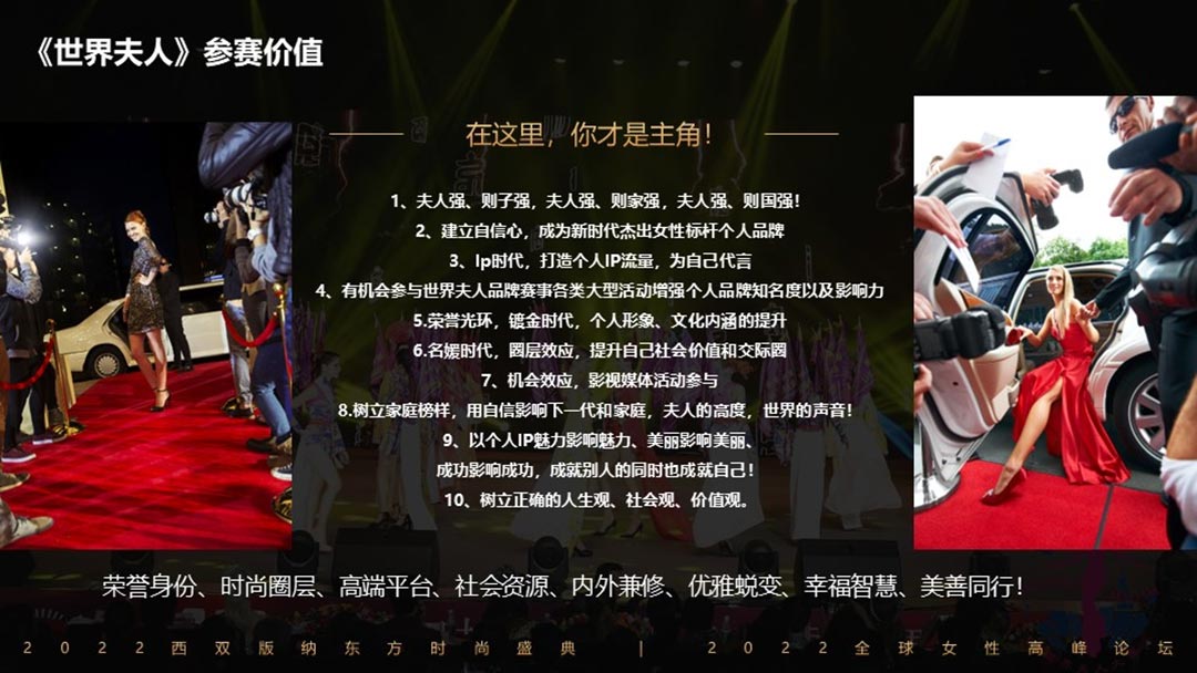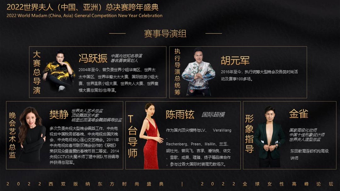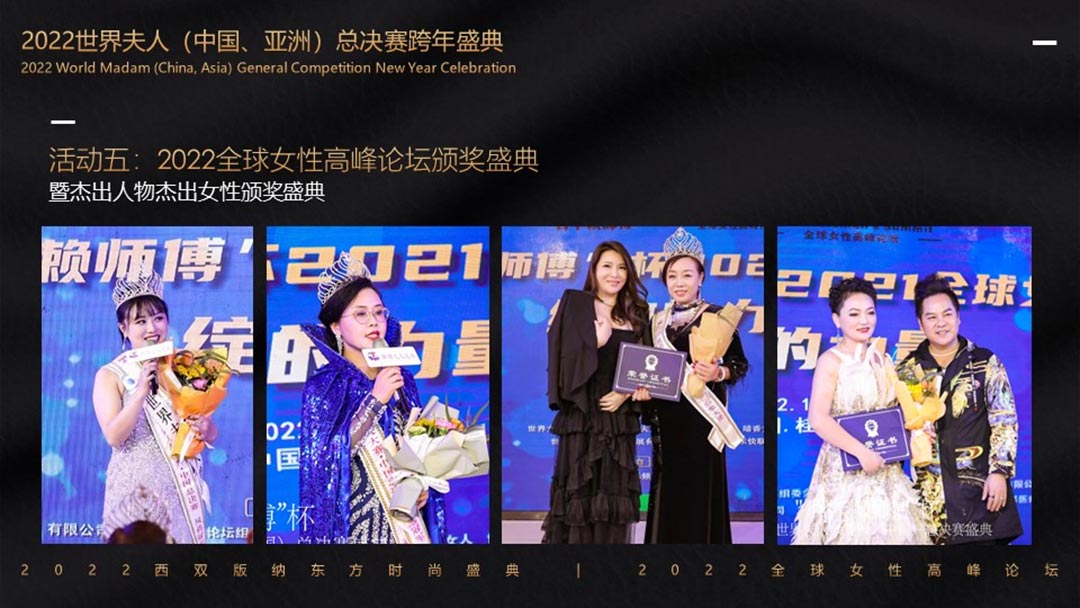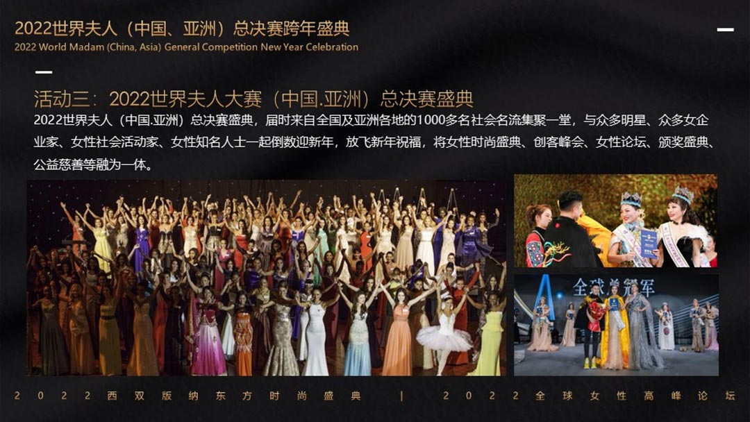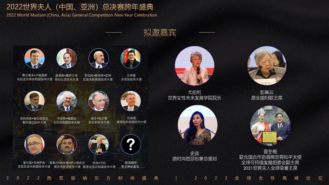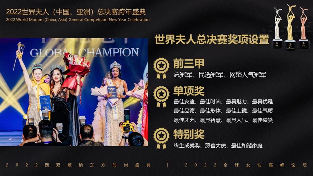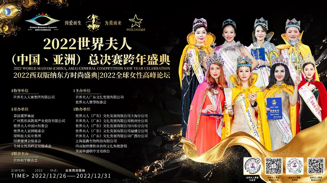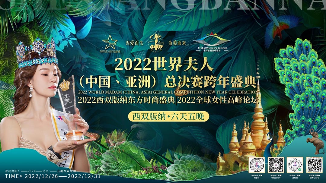 2022世界夫人(中國.洲)總決賽攜手第2屆全球女性高峰論壇暨2022東方時尚盛典暨全球女性高峰論壇共同舉辦頒獎盛典,在美麗的西雙版納打造一場關于藝術、關于時尚、關于文化、關于女人的盛會!