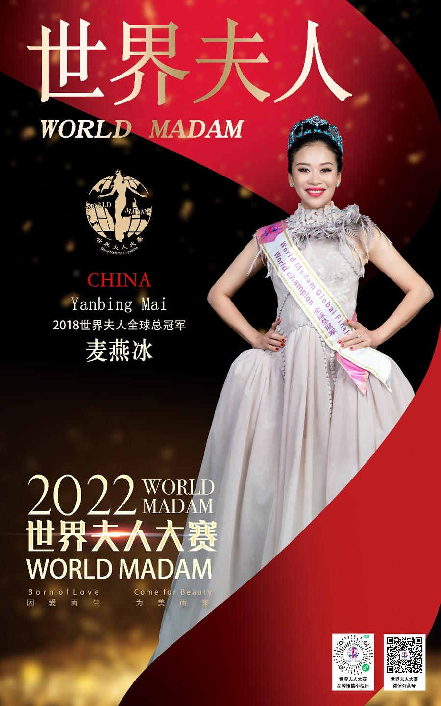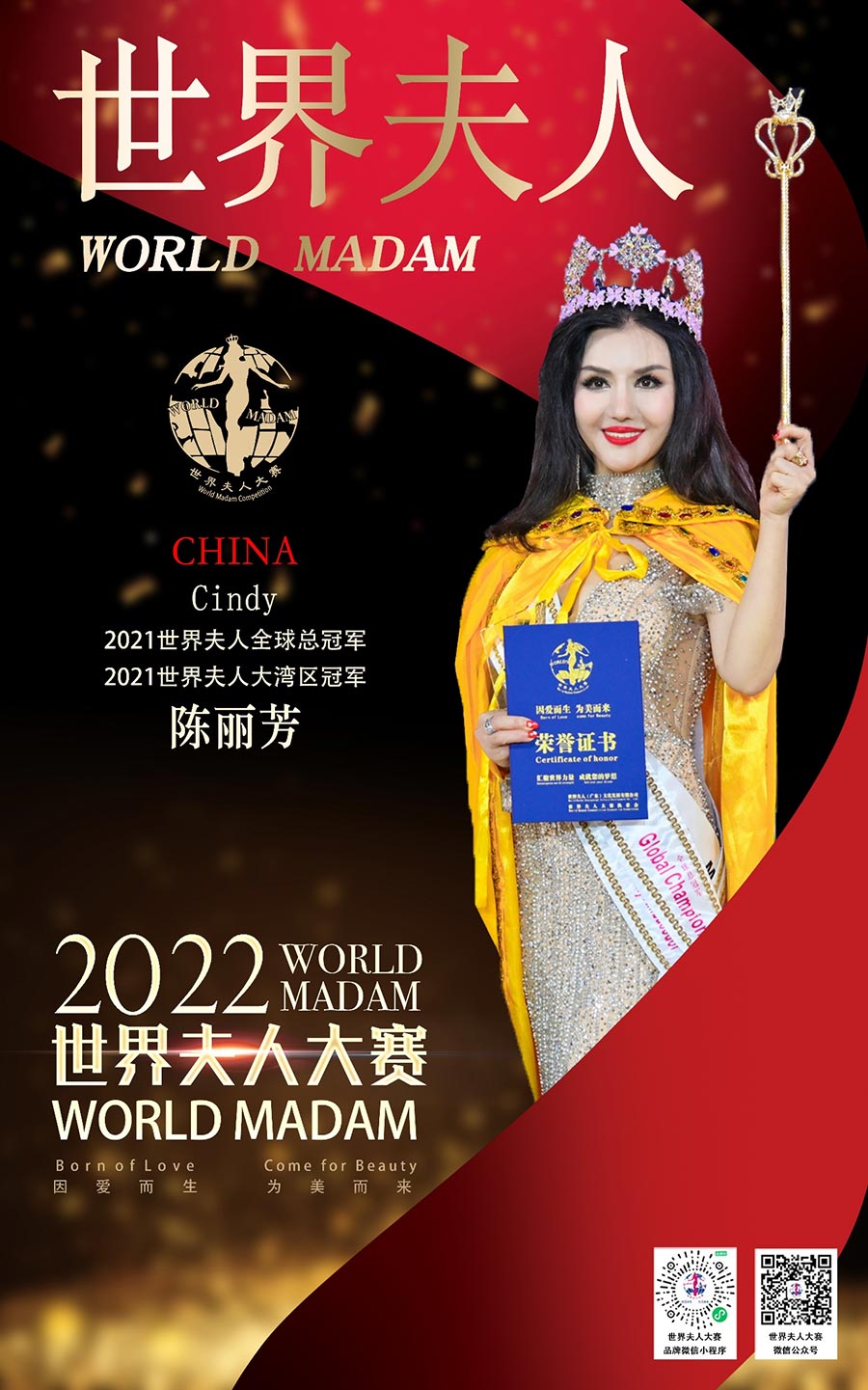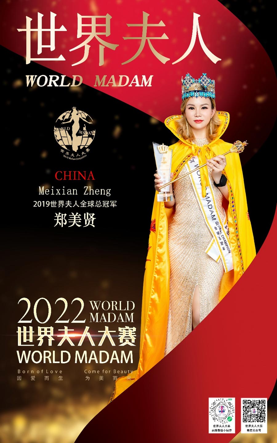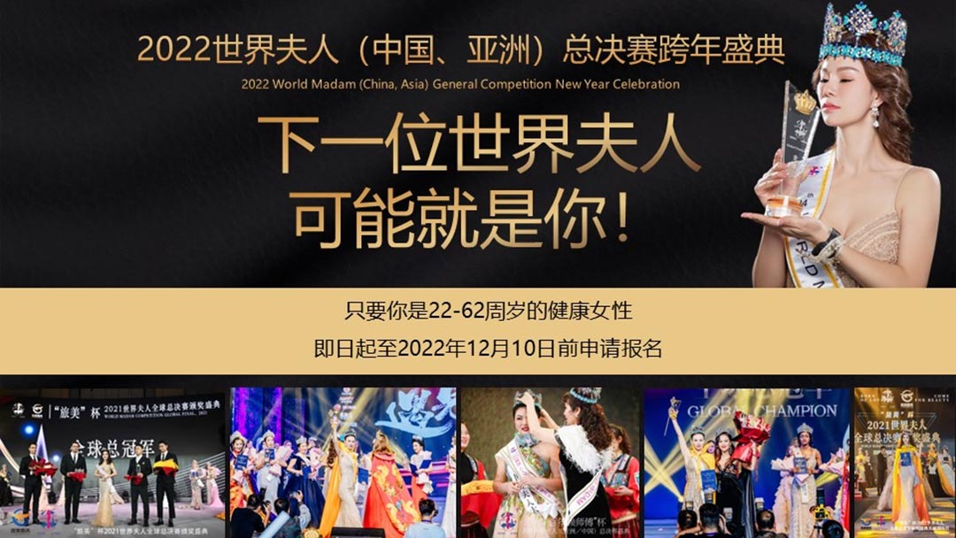 世界夫人,全球具有一定影響力的國際女性品牌賽事,被譽為現代女性時尚文化的象征,也是現代時尚主流文化象征之一,被稱為女性界的“奧斯卡”,是當今世界上知名度較高的國際女性賽事之一,由國內著名導演、世界夫人廣東文化發展有限公司創始人馮躍振kobe創辦,胡元軍擔任世界夫人大賽集團董事局主席,澳大利亞Cybele張瑜擔任全球執行主席,陳賢擔任全球常務主席,陳曉紅、麥燕冰擔任全球榮譽主席、宋南、韓福玲、周靜擔任全球副主席,陳泇芮Cherry擔任亞洲主席,董美會擔任全球名譽主席國際超模陳雨鉉擔任世界夫人全球區事業部總監,樊靜擔任全球藝術總監。