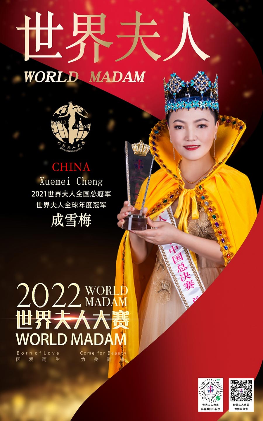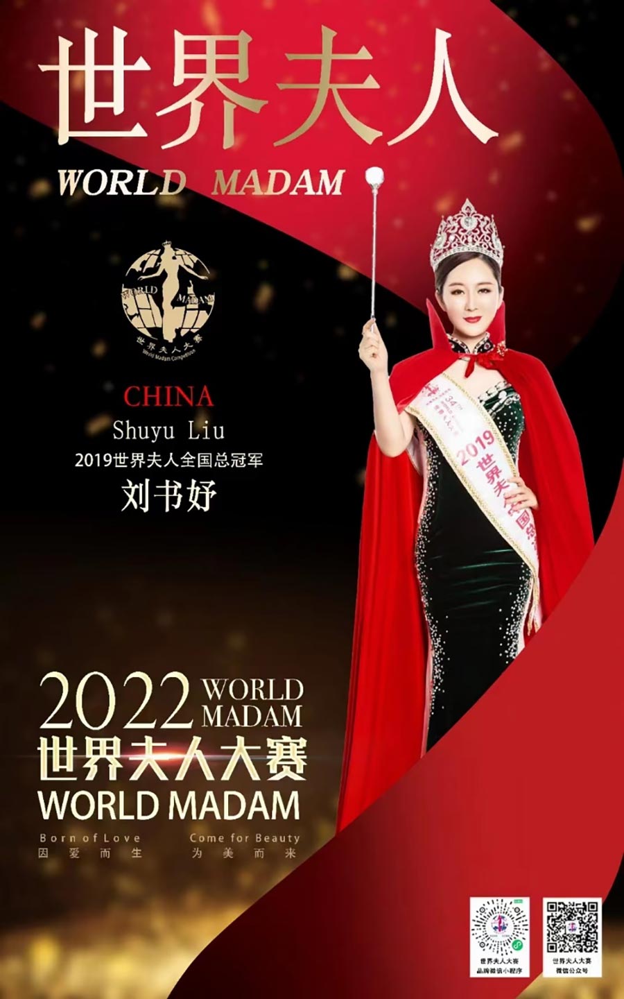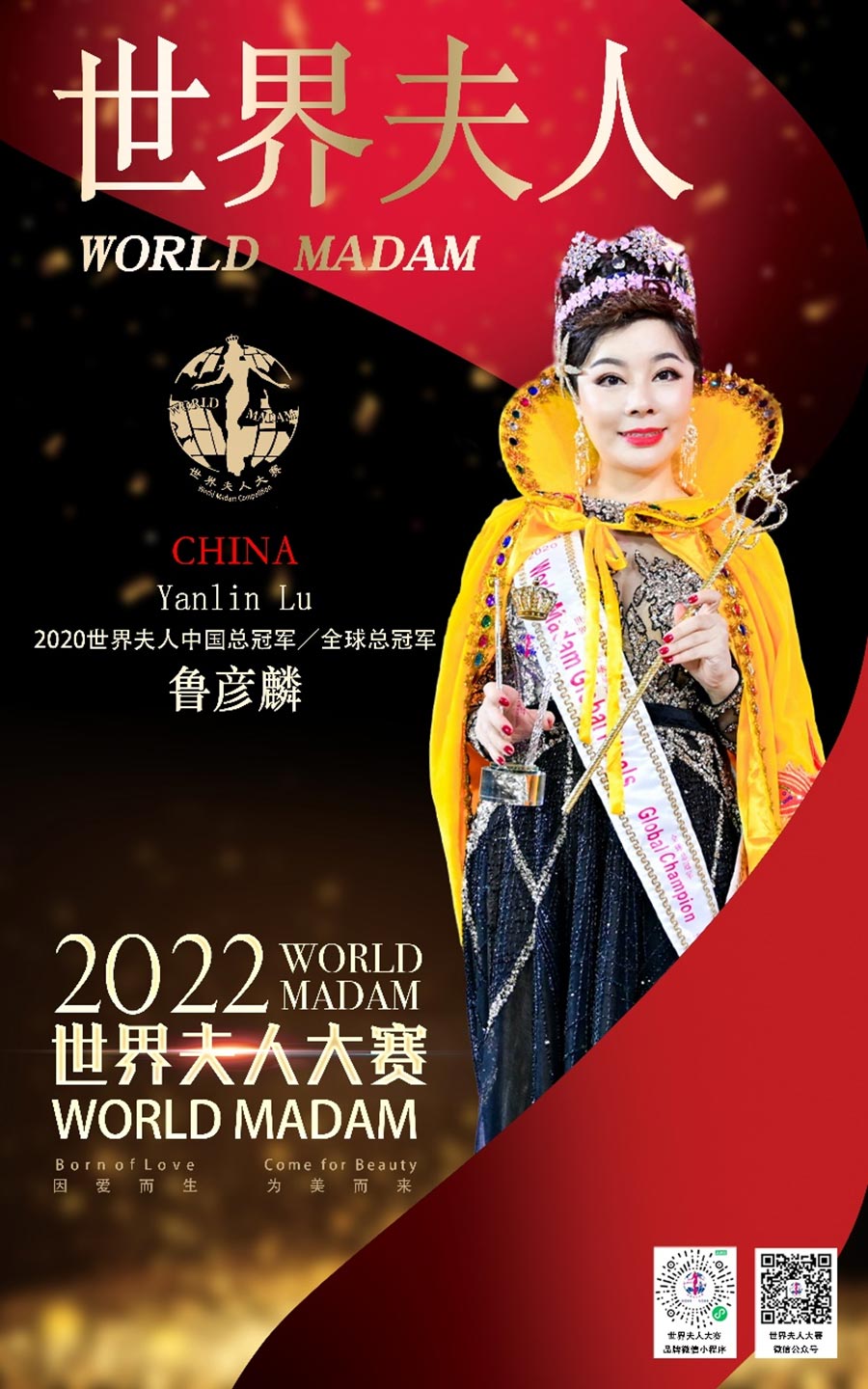 世界夫人,全球具有一定影響力的國際女性品牌賽事,被譽為現代女性時尚文化的象征,也是現代時尚主流文化象征之一,被稱為女性界的“奧斯卡”,是當今世界上知名度較高的國際女性賽事之一,由國內著名導演、世界夫人廣東文化發展有限公司創始人馮躍振kobe創辦,胡元軍擔任世界夫人大賽集團董事局主席,澳大利亞Cybele張瑜擔任全球執行主席,陳賢擔任全球常務主席,陳曉紅、麥燕冰擔任全球榮譽主席、宋南、韓福玲、周靜擔任全球副主席,陳泇芮Cherry擔任亞洲主席,董美會擔任全球名譽主席國際超模陳雨鉉擔任世界夫人全球區事業部總監,樊靜擔任全球藝術總監。