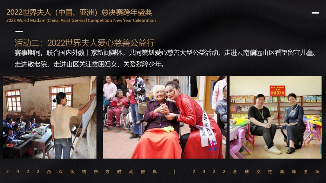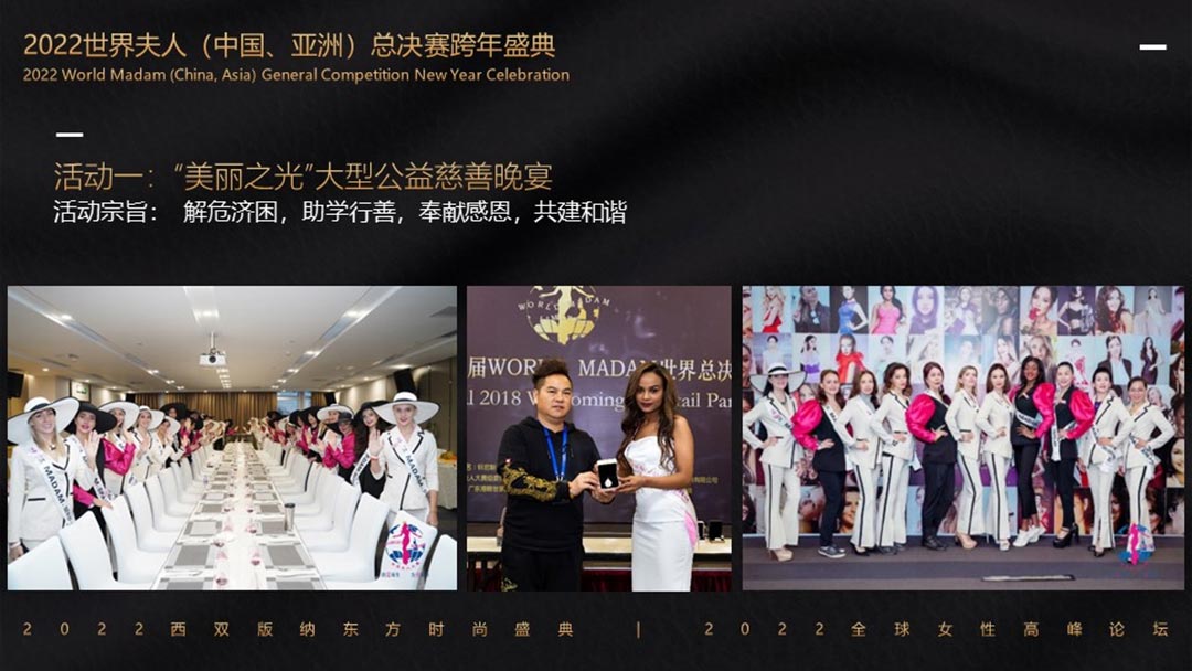 屆時,來自全國以及全亞洲各分賽區選送的300多名世界夫人就將匯聚在美麗的西雙版納,開啟為期一周的世界夫人西雙版納美麗集訓營。集旅游采風拍攝,愛心公益行,最終,世界夫人(中國.洲)總決賽的總冠軍將在萬眾矚目下誕生。她將代表中國參加明年舉辦的世界夫人全球總決賽,與50余個國家的世界夫人冠軍共同角逐全球年度總冠軍。