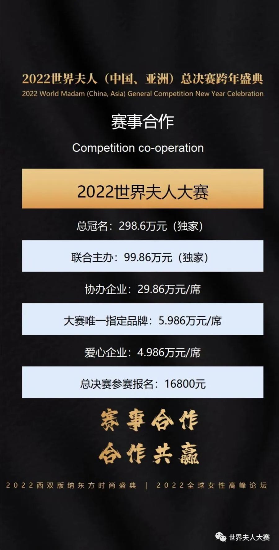 值得一提的是,今年,世界夫人總決賽跨年盛典的口號是匯聚世界力量、成就你的夢想,屆時來自全國及全亞洲以及全亞洲各地的1000多名社會名流集聚一堂,與眾多明星、眾多女企業家、女性社會活動家、女性知名人士一起倒數迎新年,放飛新年祝福,將女性時尚盛典、創客峰會、女性論壇、頒獎盛典、公益慈善等融為一體。